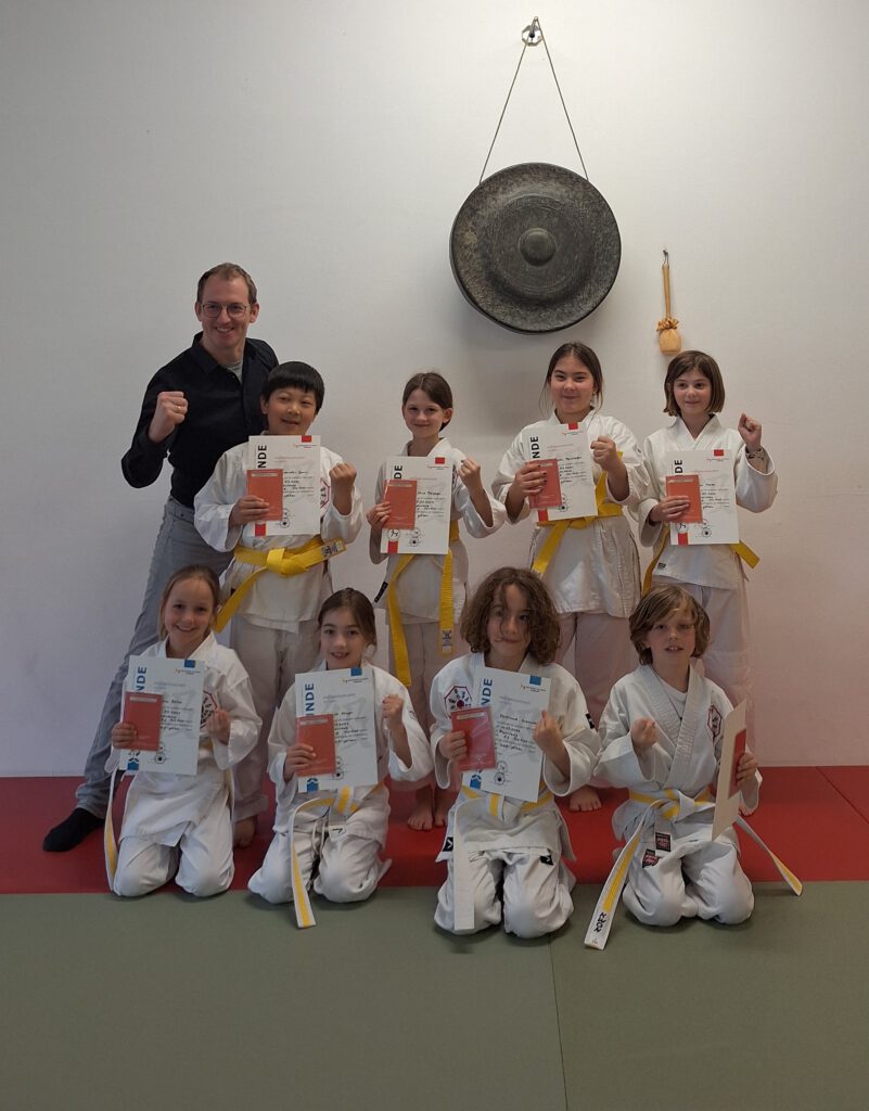 Für acht Kinder wurde es heute, dem 16. März, ernst: Es stand die erste bzw. zweite Gürtelprüfung in ihrer Ju-Jutsu-Laufbahn an. Nervös und sehr aufgeregt fanden sie sich um 10:15 Uhr im Dojo für das große Ereignis ein. Nach zwei Stunden, in denen sie ihr in den letzten Wochen intensiv geübtes Können dem Prüfer Christian Brabänder zeigen durften bzw. mussten, kam für alle die erlösende Nachricht: BESTANDEN!