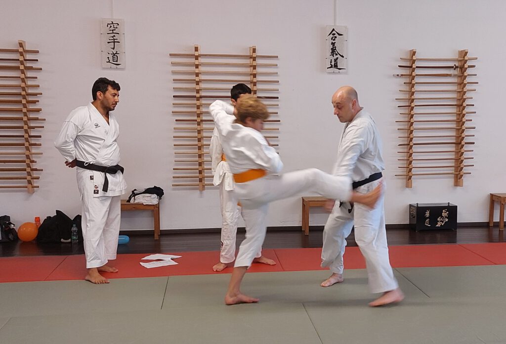 Das Duo-System ist eine Form des Ju Jutsu-Wettkampfes. Hier wird allerdings nicht wie im Fighting einzeln, sondern paarweise gegeneinander gekämpft. Am 06. Juli 2024 war es soweit. Zum ersten Mal in der Geschichte des Budokan kamen zwei Experten auf dem Gebiet des Duo-Wettkampfes zu uns: Thomas Schäfler und Adam Paszkiewicz. Zum Aufwärmen mussten wir händchenhaltend durch das Dojo „tanzen“. Anschließend gingen wir zu den verschiedenen vom Verband festgelegten Serienangriffen über. Jedes Paar hatte sich im Vorfeld schon Techniken überlegt, die nun individuell eingeübt wurden. Adam und Thomas haben sich für jedes Duo Zeit genommen und es persönlich beraten. Sie gaben den jungen Teilnehmenden viele wertvolle Tipps, um ihre Kombinationen zu verbessern. Die vier Stunden waren sehr anstrengend und lehrreich, aber trotzdem wurde auch viel gelacht und alle hatte sehr viel Spaß.