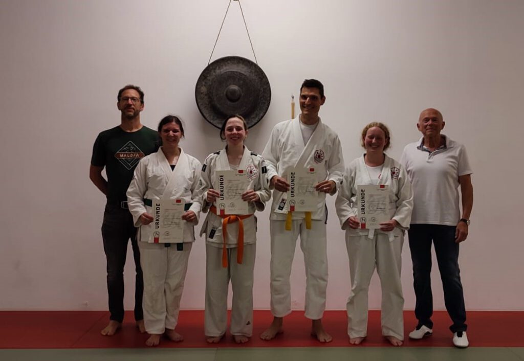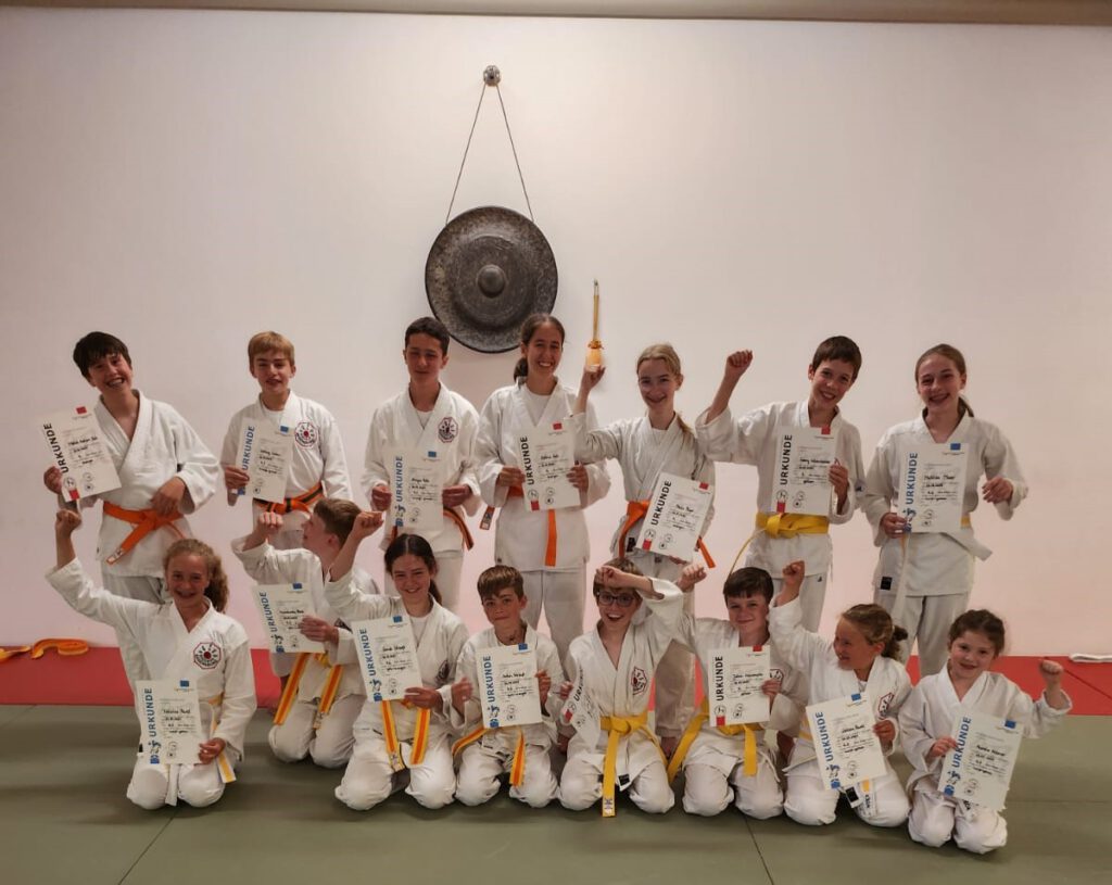 Am Samstag, dem 22. Juli. 2024 traten 15 aufgeregte Kinder und Jugendliche auf die Matte, um dem Prüfer Matthias Dietz ihr Können zu zeigen. Zwei Stunden lang präsentierten sie eifrig Fallschule, Handballenstöße, Hüftwurf und Seitstreckhebel. Dann stand endlich fest, dass alle die Prüfung erfolgreich abgelegt haben und ab sofort einen neuen schicken Gürtel zu tragen.