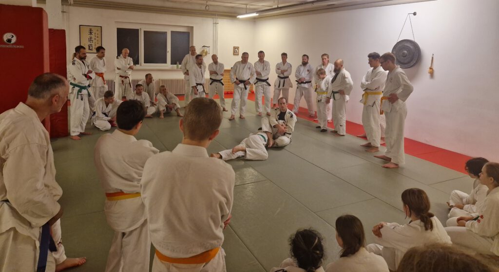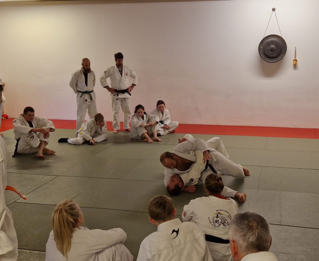 Kurzfristig sprang Christian Brabänder (3. Dann JJ) als Referent zu dem Thema Anwendungen am Boden ein. Dabei bekam er hilfreiche, kompetente und tatkräftige Unterstützung von unserem Jugendreferenten Michael Rampp (2. Dan JJ).