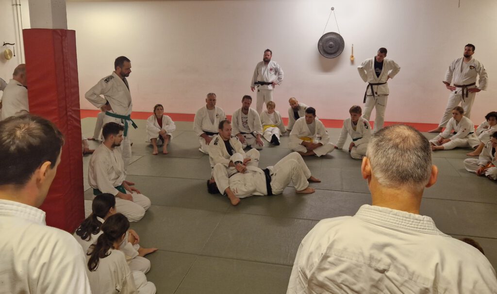 Den ersten Teil des Lehrgangs sowie das Aufwärmtraining übernahm Michael. Mit seiner humorvollen Art brachte er bereits zu Beginn eine gute Stimmung auf die gesamte Matte und brachte dabei die Teilnehmer*innen ganz schön zum Schwitzen.