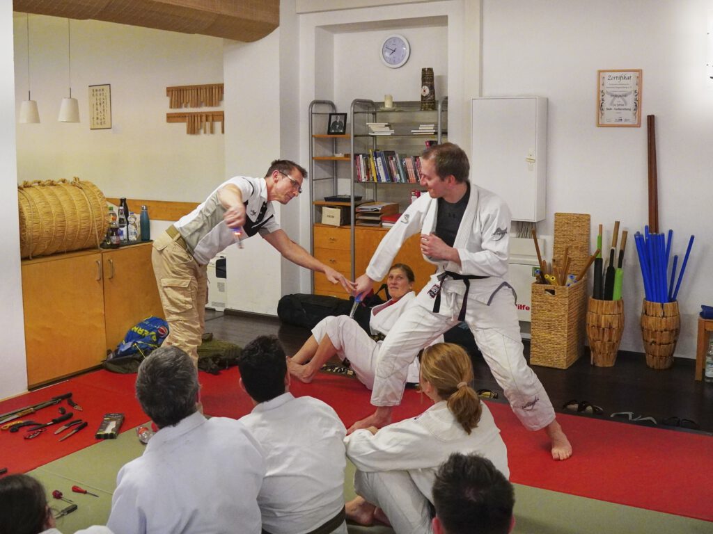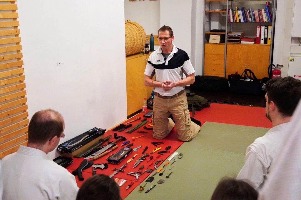 Tom Neu ist kurzfristig für das Stützpunkttraining beim Budokan eingesprungen und speziell dafür nach Regensburg gereist. Zur Thematik Abwehr gegen Messerangriffe brachte er gleich ein ganzes Waffenarsenal mit.