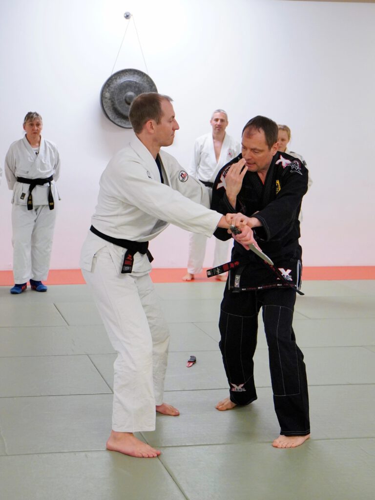 Ziel der Trainingseinheiten war es, den Angreifer effektiv zu kontrollieren, zu Boden zu bringen oder das Messer zu sichern. Eine zentrale Rolle spielten dabei ein stabiler Stand sowie eine präzise und sichere Beinarbeit – entscheidende Faktoren für eine erfolgreiche Verteidigung.