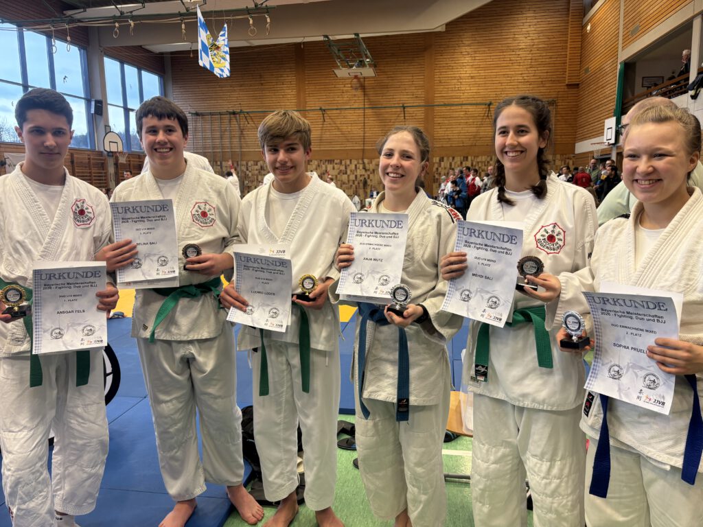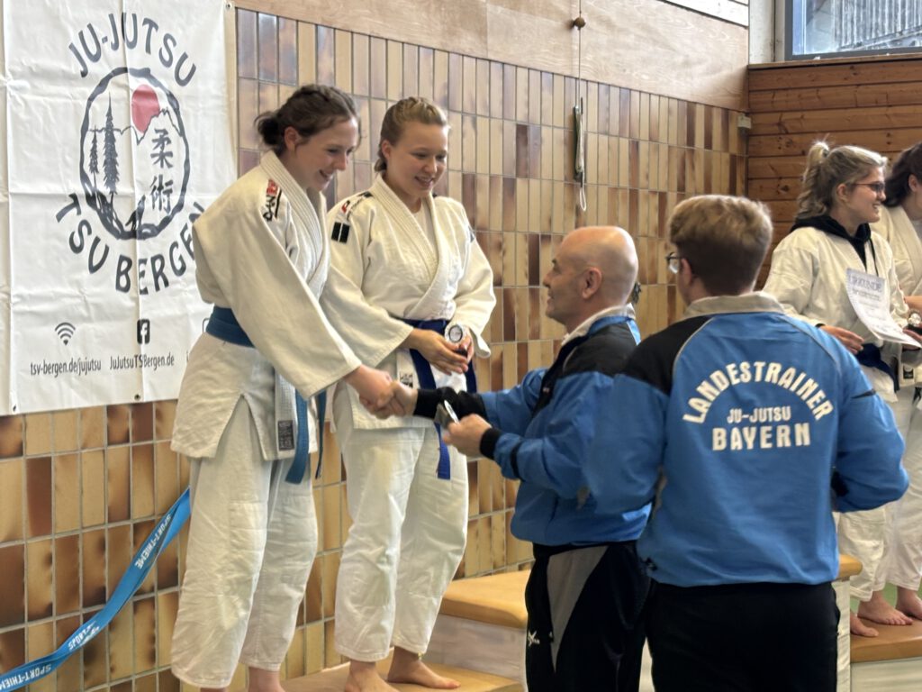 Regensburg’s Duo Trio hat wieder zugeschlagen, dieses Mal bei den Bayerischen Meisterschaften in Bergen in der Nähe des Chiemsees. Anja und Sophia waren bereits in der Vorrunde stark dabei und spielten ganz vorne mit bei den Erwachsenen und es ging weiter ins Halbfinale. Wegen einer Verletzung im gegnerischen Team sind die beiden direkt ins Finale eingezogen. In der letzten Runde hat’s dann leider nicht ganz für ganz oben gereicht und konnten sich, mit einer alles in allem tollen Leistung verdient Silber sichern🥈 . Nach etwas Verzögerung ging es dann endlich um ca. 13:15 mit den Vorrunden der U18 los. Alle vier Paare, darunter die Salis’ und Ludwig und Ansgar, waren alle auf Augenhöhe und am Ende trennten die letzten drei Plätze nur 3 Punkte. Ansgar und Ludwig auf dem 2. Platz, die Salis auf dem 4. Rang -> Ansgar und Ludwig kämpfen gegen den 3. Platz; die Salis müssen gegen das wirklich gute erste Paar im Halbfinale ran. Wenig später ging’s dann los, die Salis sicherten sich verdientes Bronze🥉und für Ludwig und Ansgar ging’s weiter ins Finale. Es war hart, es war fair, und am Ende war es ein Punkt, der den Unterschied gemacht hat: endlich am selben Ort, an dem alles begann, hat es heute für Gold gereicht 🥇. Durch die Leistungen an diesem Tag haben sich alle drei Paare für die Süddeutsche Meisterschaft bei Karlsruhe im April qualifiziert🥋. Wieder einmal dürfen wir uns bei unserem gesamten Verein für den tollen Support bedanken!