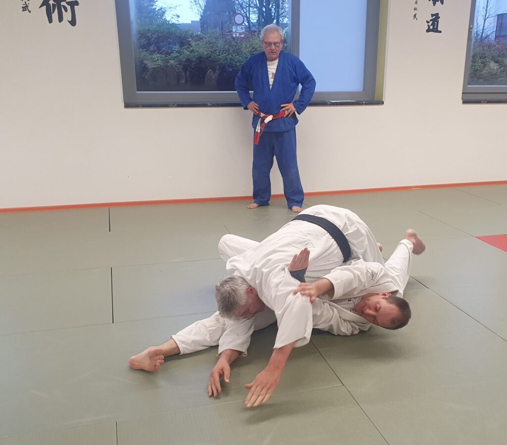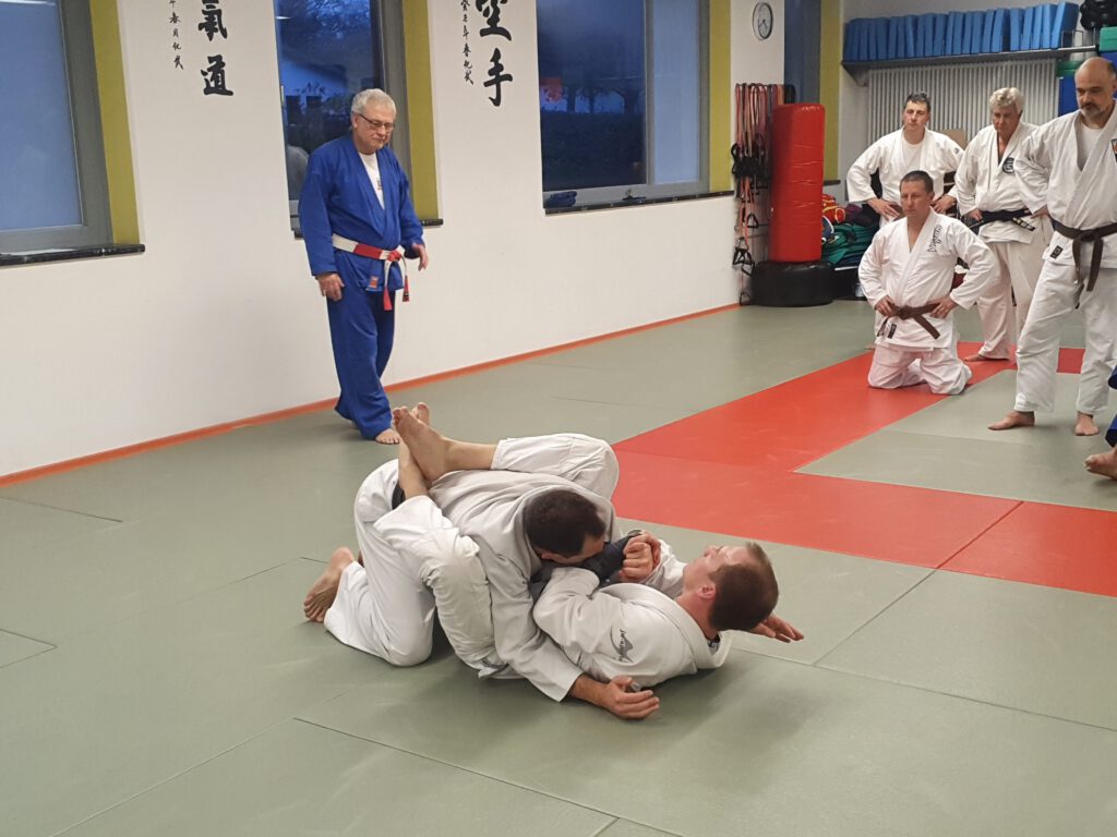 Nach der Halbzeit übernahm Christian Brabänder zum Thema Bodentechniken. Der Schwerpunkt lag auf verschiedenen Befreiungstechniken aus der Kreuzposition. Mit seinen unterschiedlichen Technikkombinationen gab der Referent den Ju-Jutsukas ein breites Spektrum an diversen Befreiungs- und Handlungsmöglichkeiten mit auf den Weg.